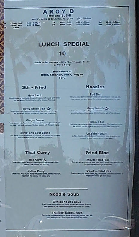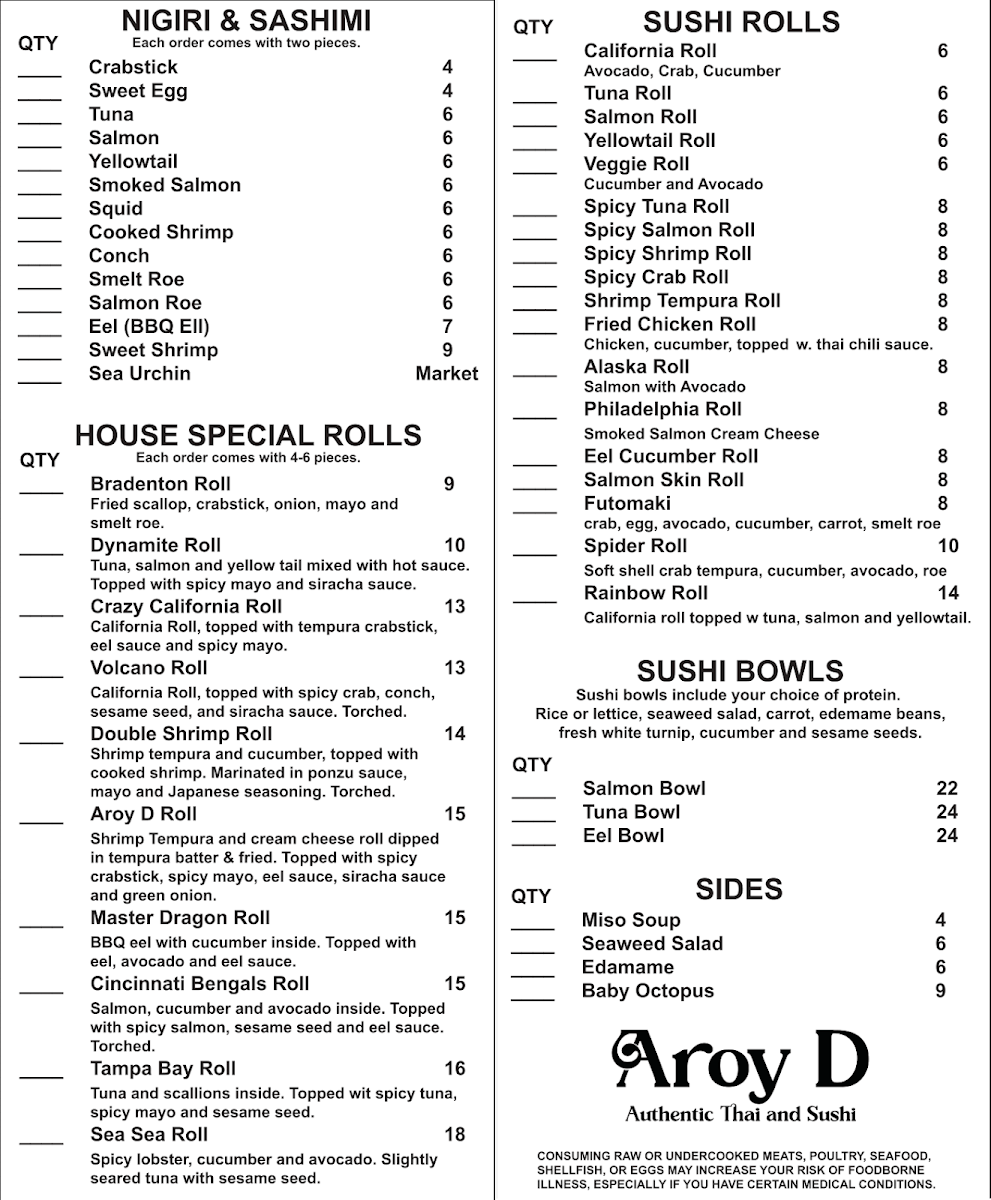 Welcome to Aroy D Thai and Sushi, a hidden gem located in Bradenton, FL. This vibrant eatery specializes in authentic Thai cuisine and fresh sushi, with dishes crafted from the heart. The menu showcases enticing offerings such as the Duck Noodle Soup and the classic Tom Kha Soup, both enriched with fresh vegetables and aromatic broths that transport you straight to Thailand.