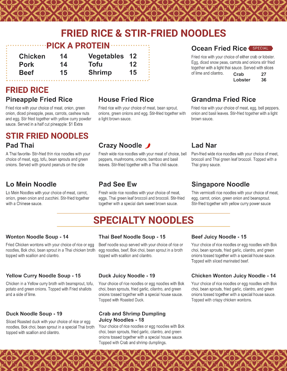 Fresh wide rice noodles with your choice of meat, eggs, Thai green leaf broccoli and broccoli. Stir-fried together with a special dark sweet brown sauce.