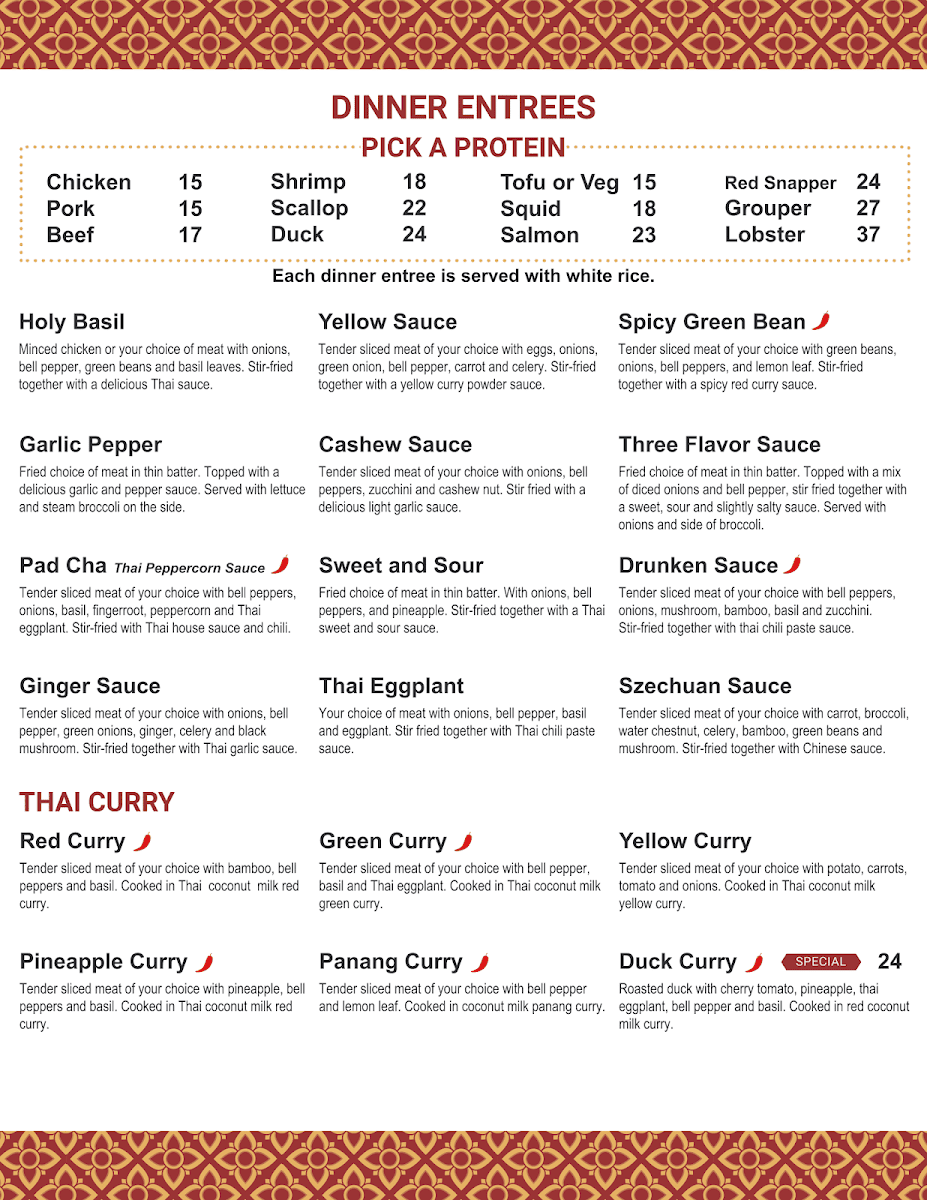 Spicy. Tender sliced meat of your choice with bell peppers, onions, mushroom, bamboo, basil, and zucchini. stir-fried together with Thai chili paste sauce.